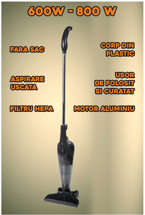 Aspirator vertical 2 in 1 HAUSBERG HB-2025NG, fara sac, aspirare uscata, filtru Hepa, 0.5 L, 600-800 W, Negru